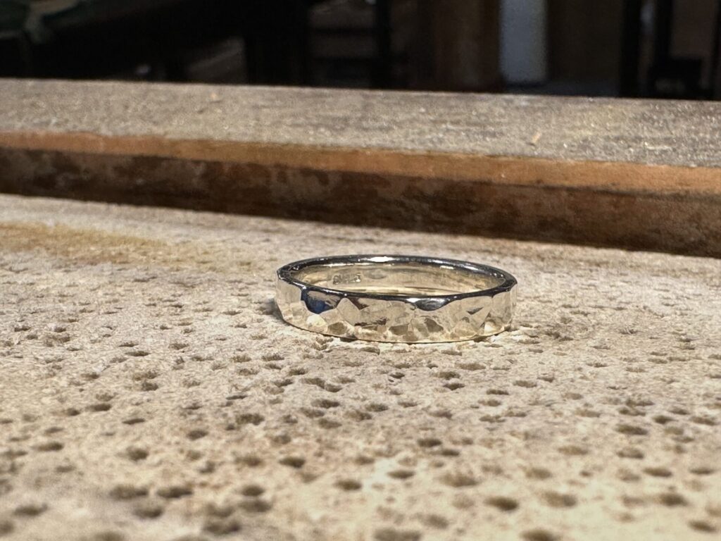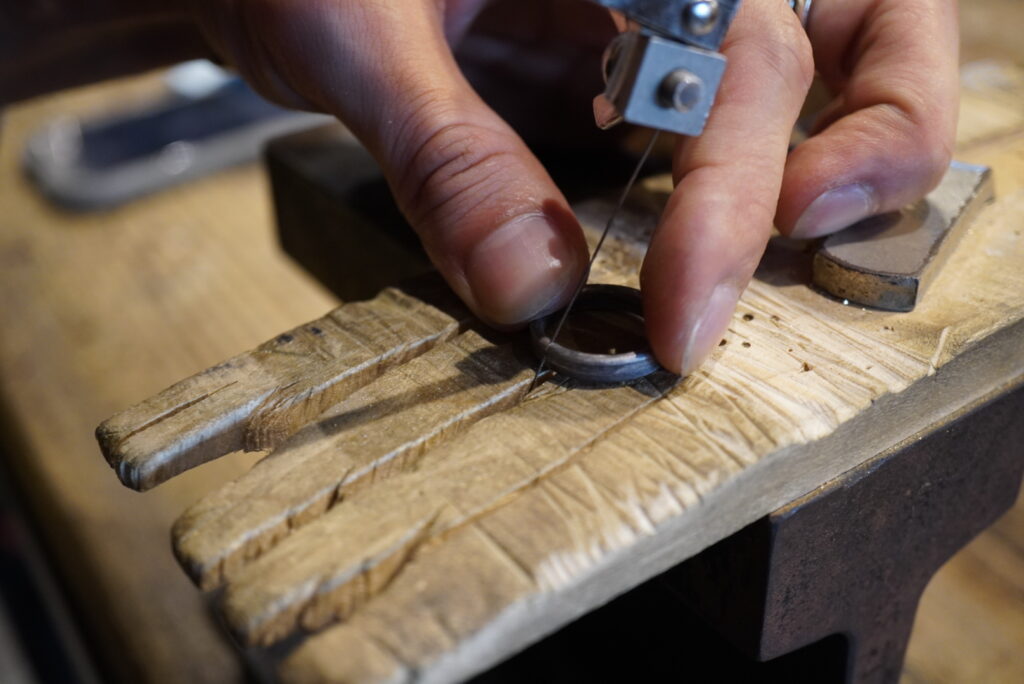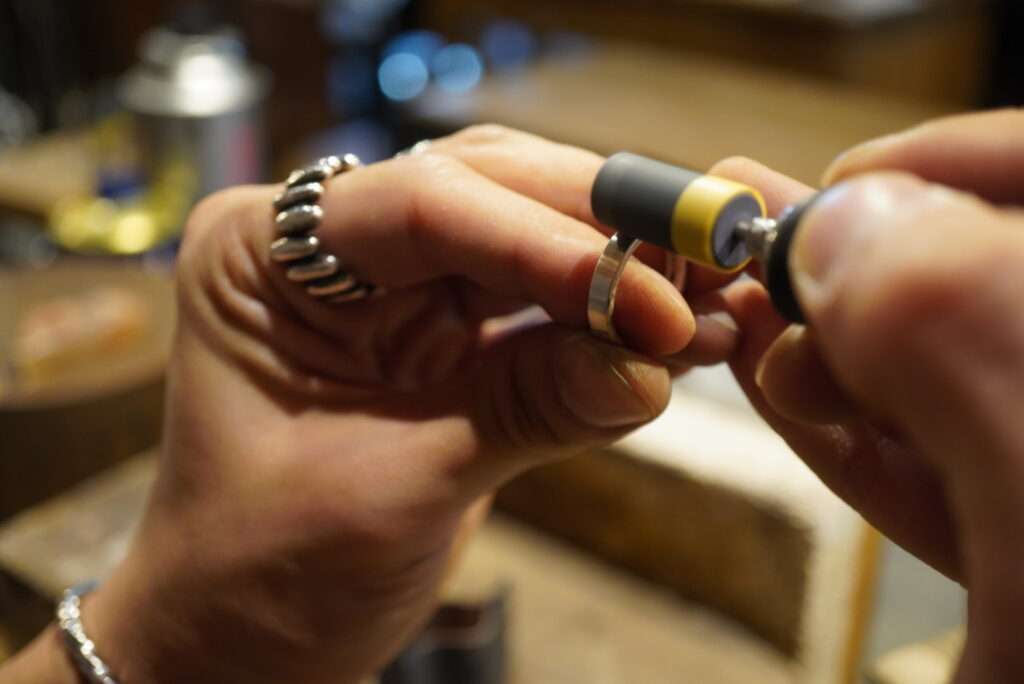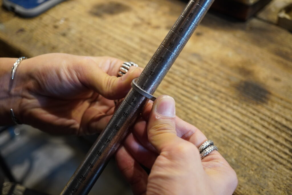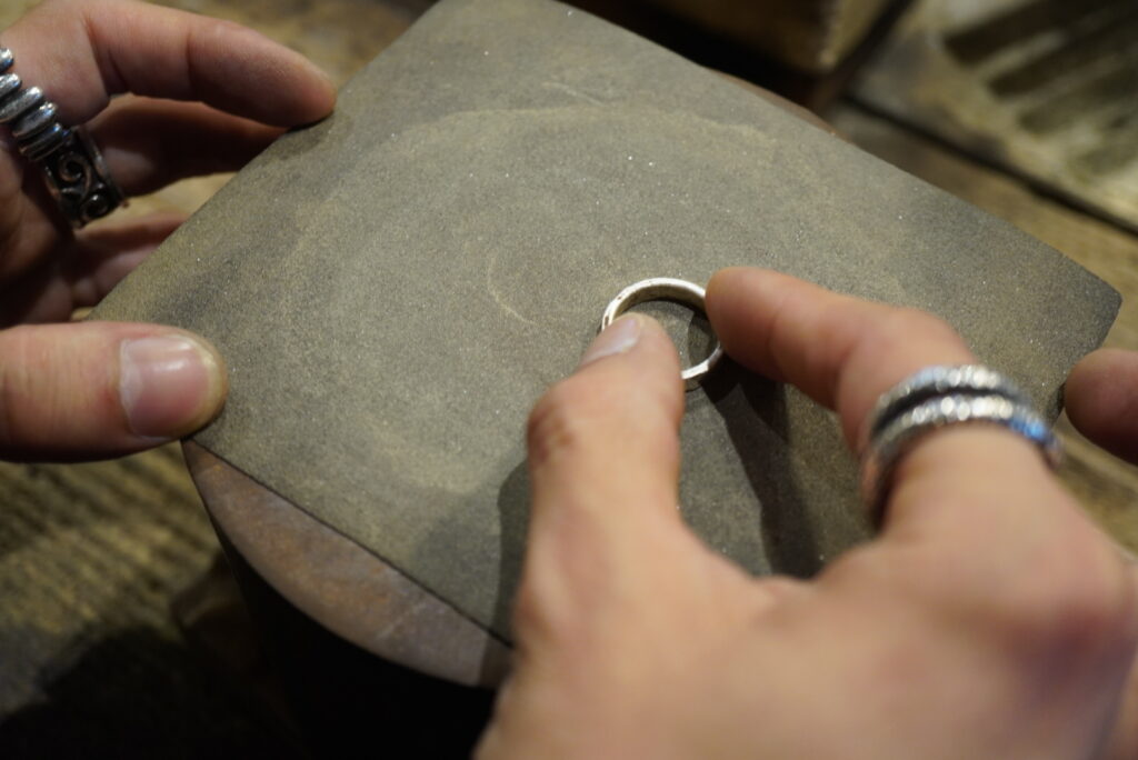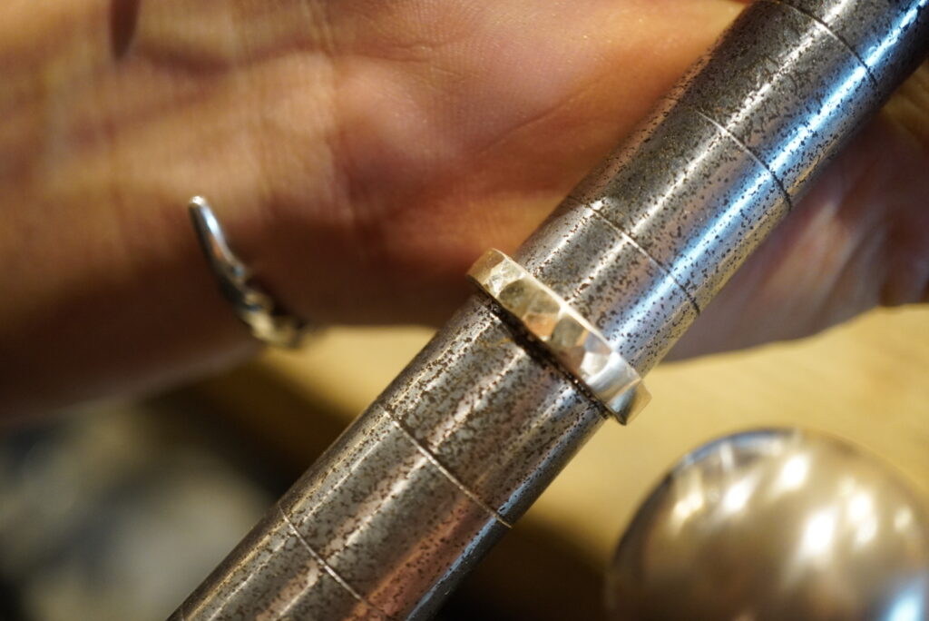 また、約2号分小さく製作したリングを叩くことで、素材を伸ばして号数を合わせていきます。