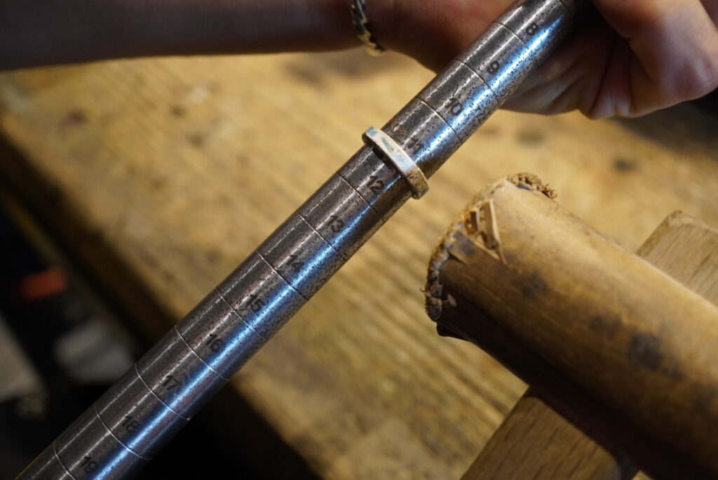次に、ロウ付けしたリングを真円にするため、芯金棒に入れて叩いていきます。
