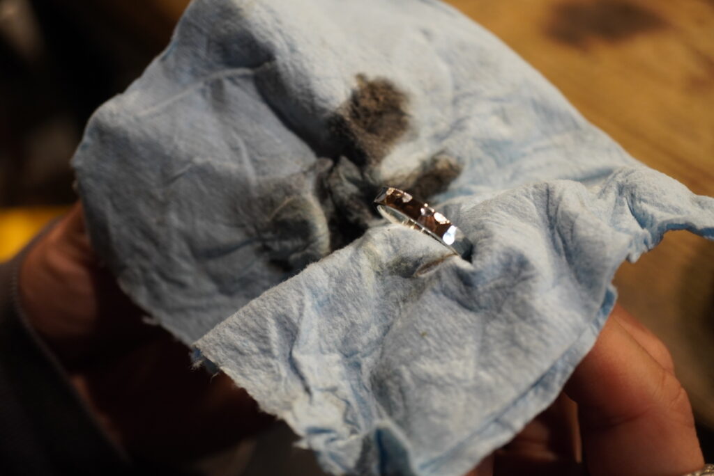 側面を紙ヤスリで削って平らに整えたら、リング内側もリューターで削って綺麗にします。