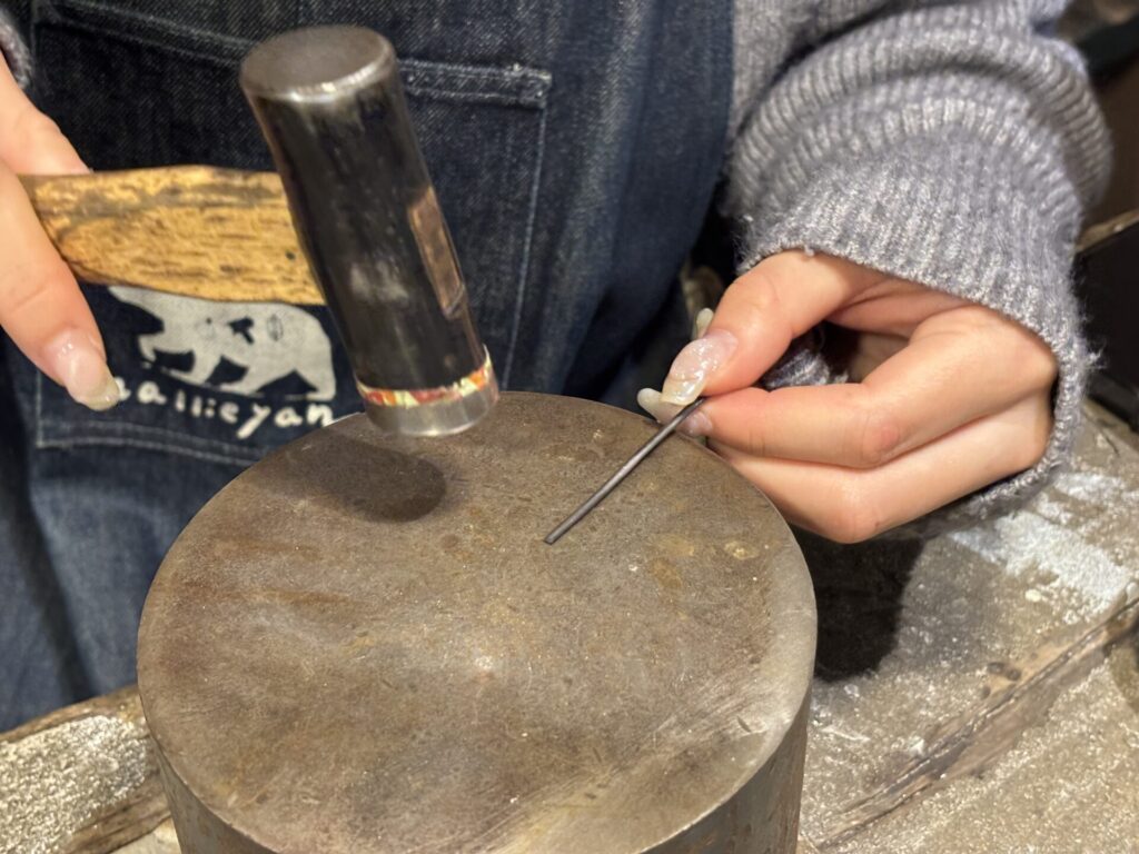 柔らかくなったら、金槌で叩いて丸い棒の状態から平らに潰していきます。
