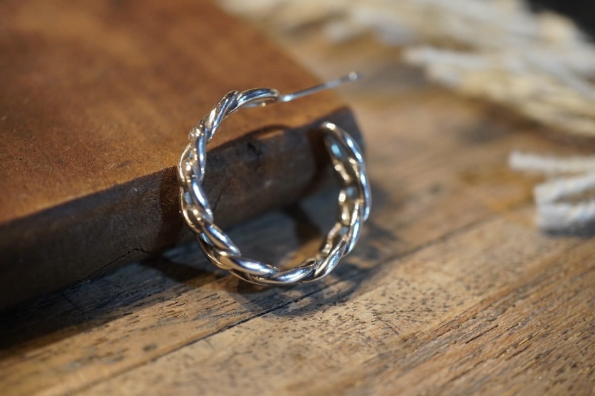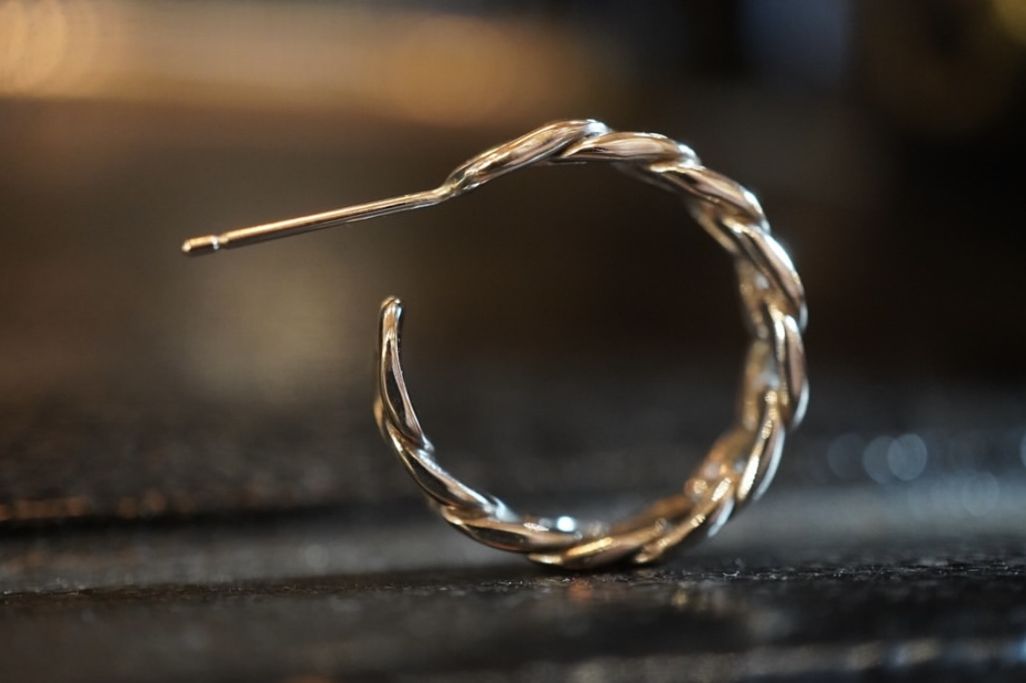連なるチェーンをそのままフープ状に仕立てた、存在感あふれるシルバーピアス。 一コマずつ立体的に組み合わさり、耳元で軽やかに揺れるたび、光を反射して奥行きのある輝きを放ちます。 シルバー特有の艶やかさと、チェーンならではの無骨さが絶妙に融合。 カジュアルスタイルにはもちろん、モードやストリート、ジェンダーレスなコーディネートとも相性抜群です。