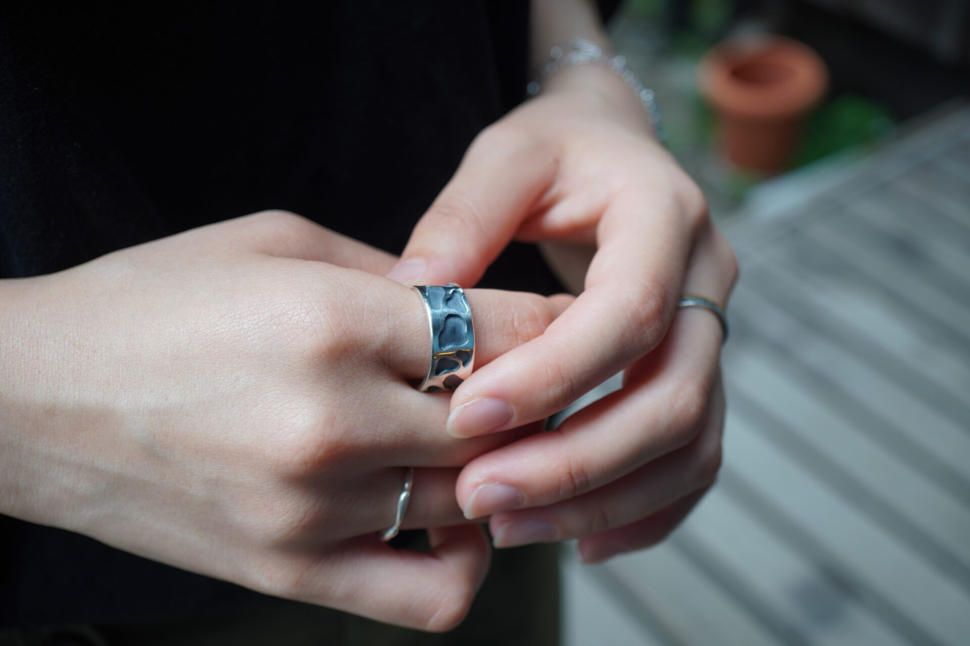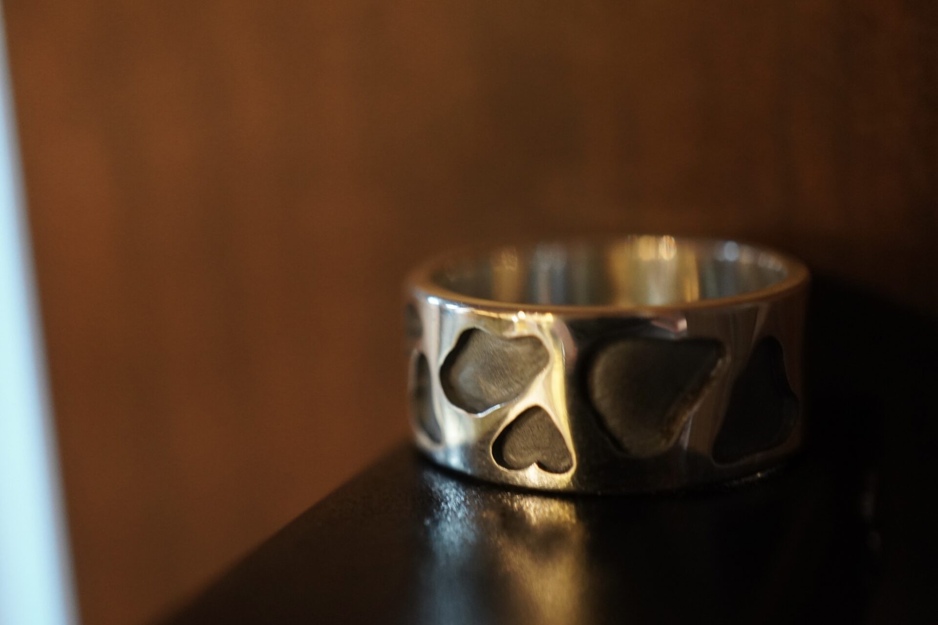 厚さ0.5mmのシルバー板を2枚使用し、 一つひとつの模様を糸鋸で丁寧に切り抜いて製作。 その後、「オーバーレイ」という技法で、土台の板と貼り合わせて立体感のある仕上がりにしています。 模様の中には、さりげなく"隠れハート"が…♡ ぜひお手に取って探してみてください😌