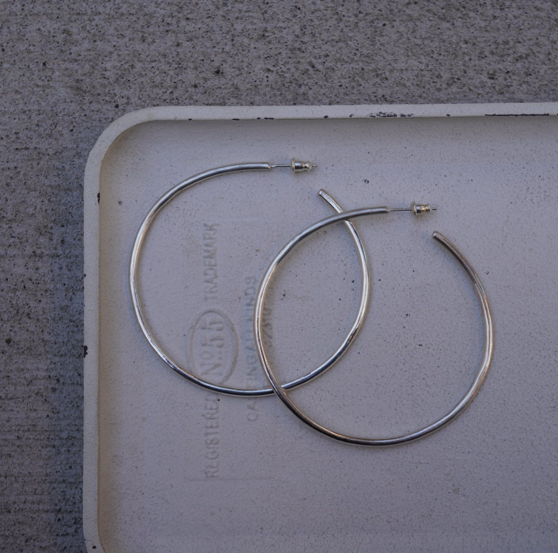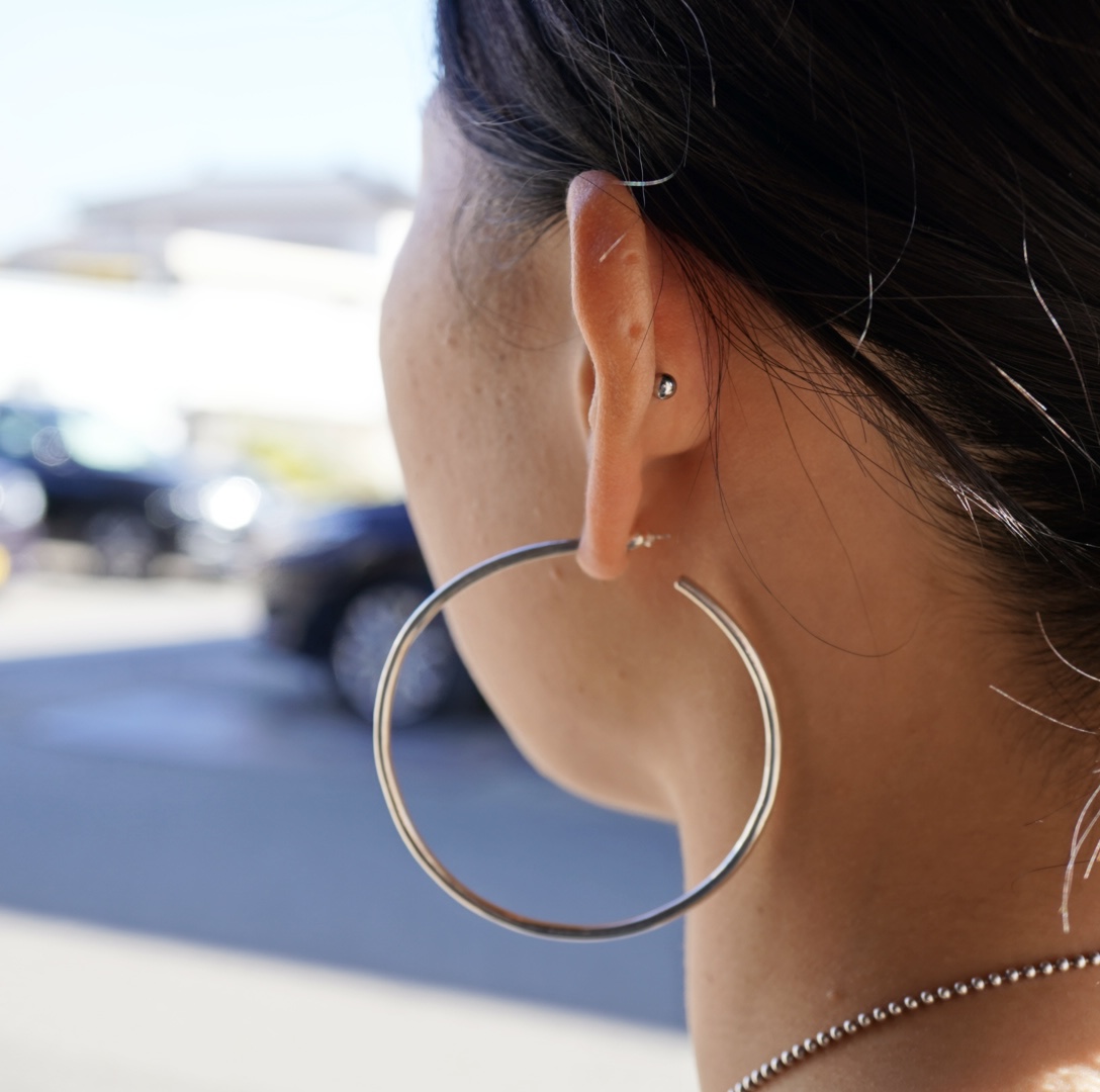 2.5mmの棒状シルバー素材を使用し、フープピアスを製作しました。 今回は直径60mmと大ぶりサイズで、存在感たっぷりの仕上がりです。 シンプルながらもインパクトがあり、 コーディネートのアクセントとしてお楽しみいただけます。 顔周りの印象を明るく見せてくれるので、 普段使いはもちろん、少し特別な日のおしゃれにもぴったりです🌟